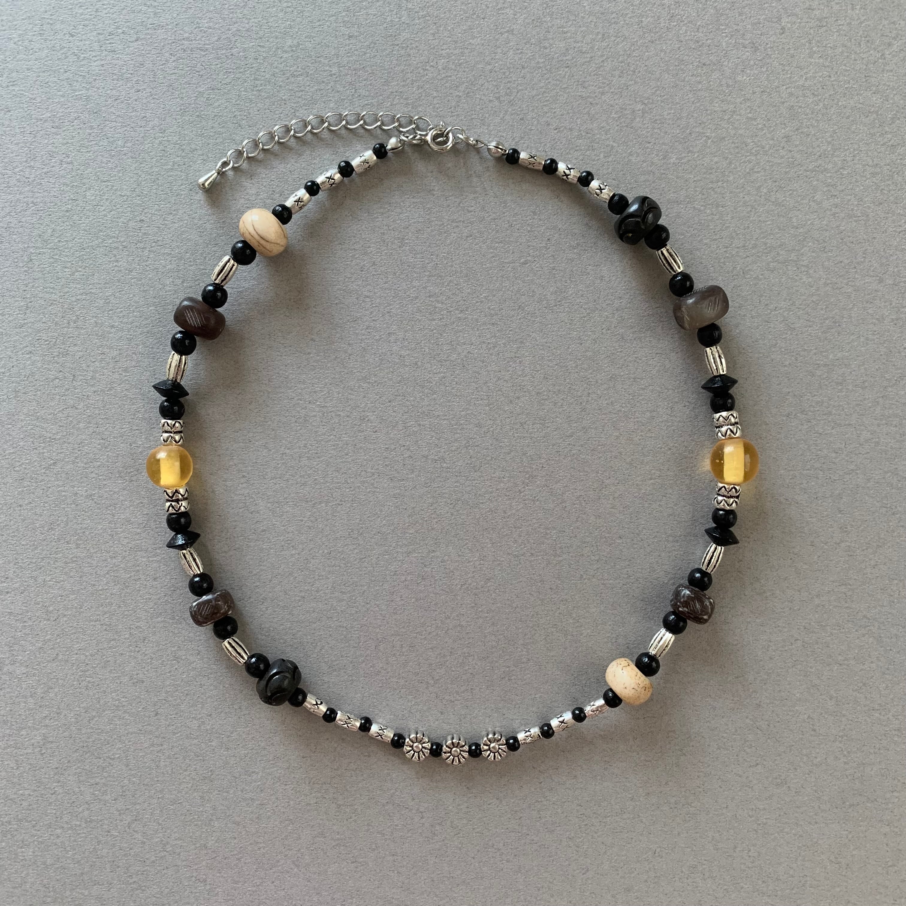 主にメタル、ウッド、ボーン、のビーズを使用して作られたネックレス。
